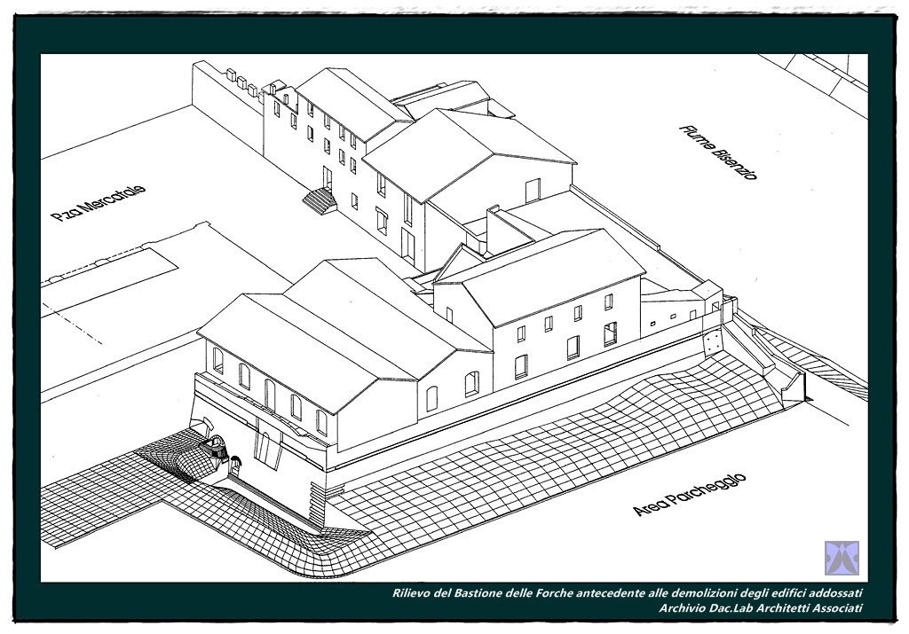 Su incarico del Comune di Prato è stata condotta una ricerca sul tema “Indagine conoscitiva sullo stato di consistenza del bastione mediceo detto “delle Forche” appartenente alla terza cerchia fortificata della città di Prato. Il gruppo di ricerca ha riunito docenti del Politecnico di Milano, della Facoltà di architettura di Firenze e professionisti provenienti da vari ambiti disciplinari (architetti, ingegneri, geologi, speleologi). La ricerca è stata finalizzata alla conoscenza storica, fisica e materica delle strutture e degli ambienti interrati e fuori terra del complesso storico ed ha costituito la base per il progetto di recupero che è partito successivamente. Gli architetti Barbucci e Di Bella, in questa fase, si sono occupati del rilievo, della restituzione grafica e della costruzione del modello grafico tridimensionale dell’intera struttura al fine di formulare ipotesi sul funzionamento interno degli ambienti e dei cinematismi strutturali. Sono stati inoltre autori dello studio della vegetazione che era presente sul baluardo. Oggi il bastione, dopo le demolizioni delle superfetazioni, lo si può vedere restaurato per la maggior parte della sua estensione. Rimane ancora una porzione di edificio da recuperare alle funzioni urbane. Nella cartina storica, cerchiato, è individuato il bastione oggetto di studio.