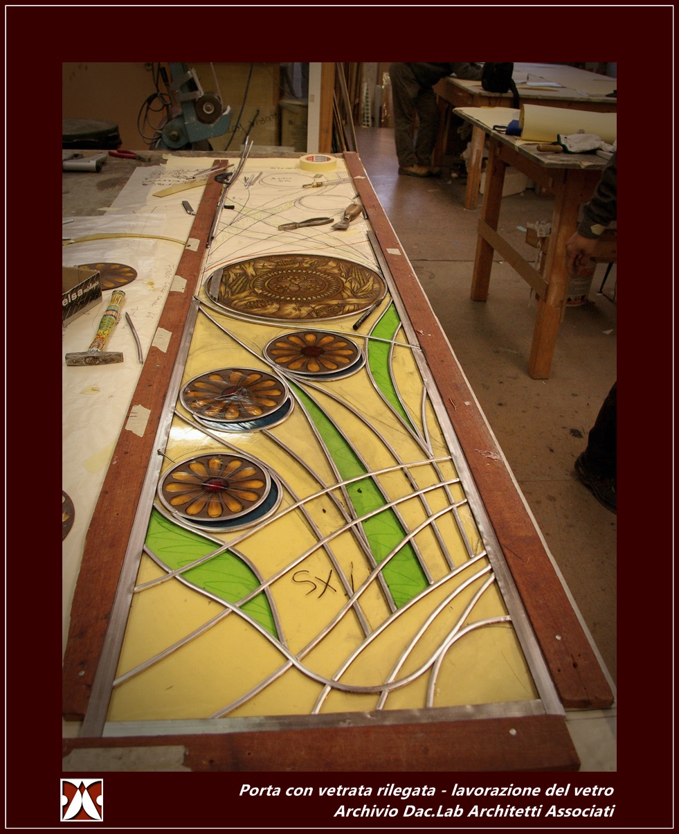 Porta a due ante realizzata in legno di noce nazionale. Divide l’ambiente della cucina dal soggiorno di un edificio abitativo unifamiliare. Le vetrate, composte da vetri artistici di diversi colori, sono realizzate mediante la tecnica della rilegatura a piombo.